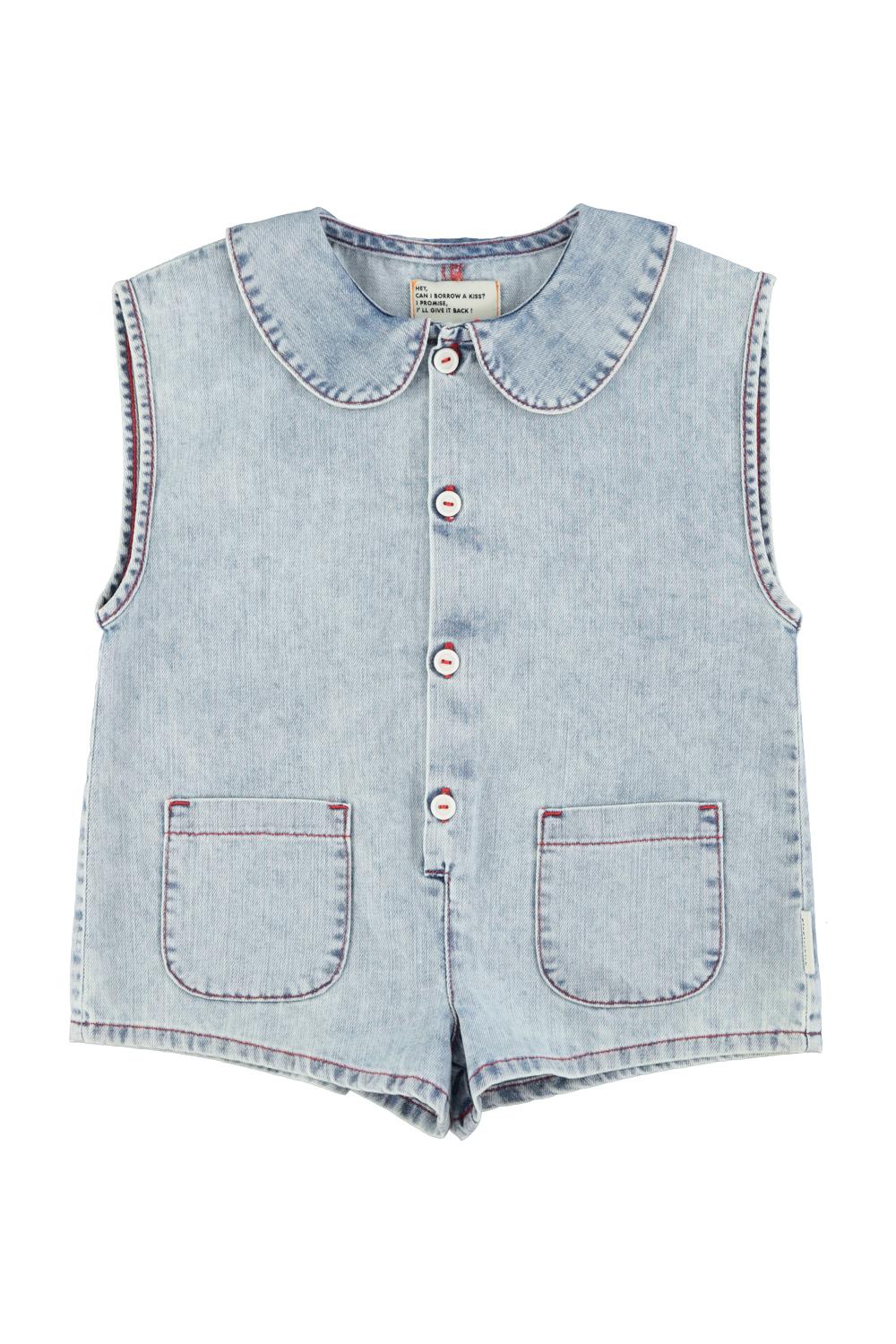 | short sleeveless jumpsuit | blue light denim w/ apple print |