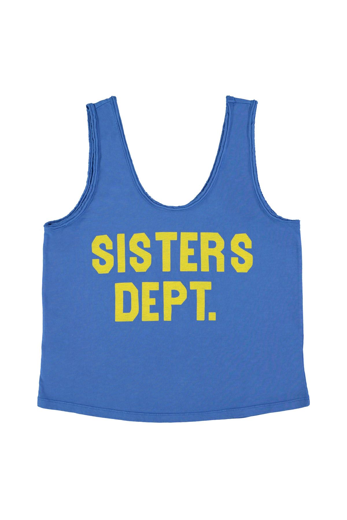 Sisters Department,"Sleeveless top w/ v-neck | Blue w/ ""sisters dept."" print "