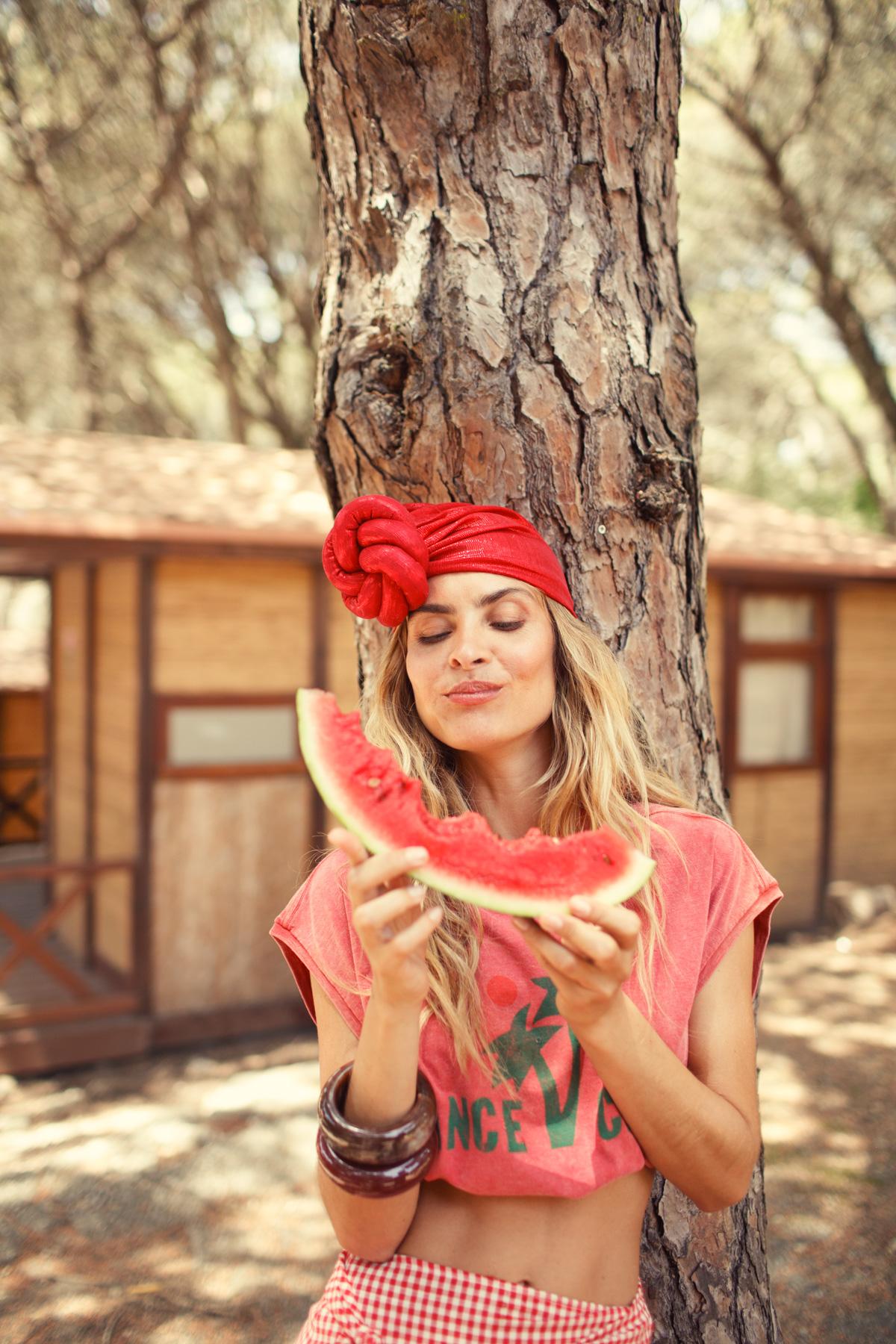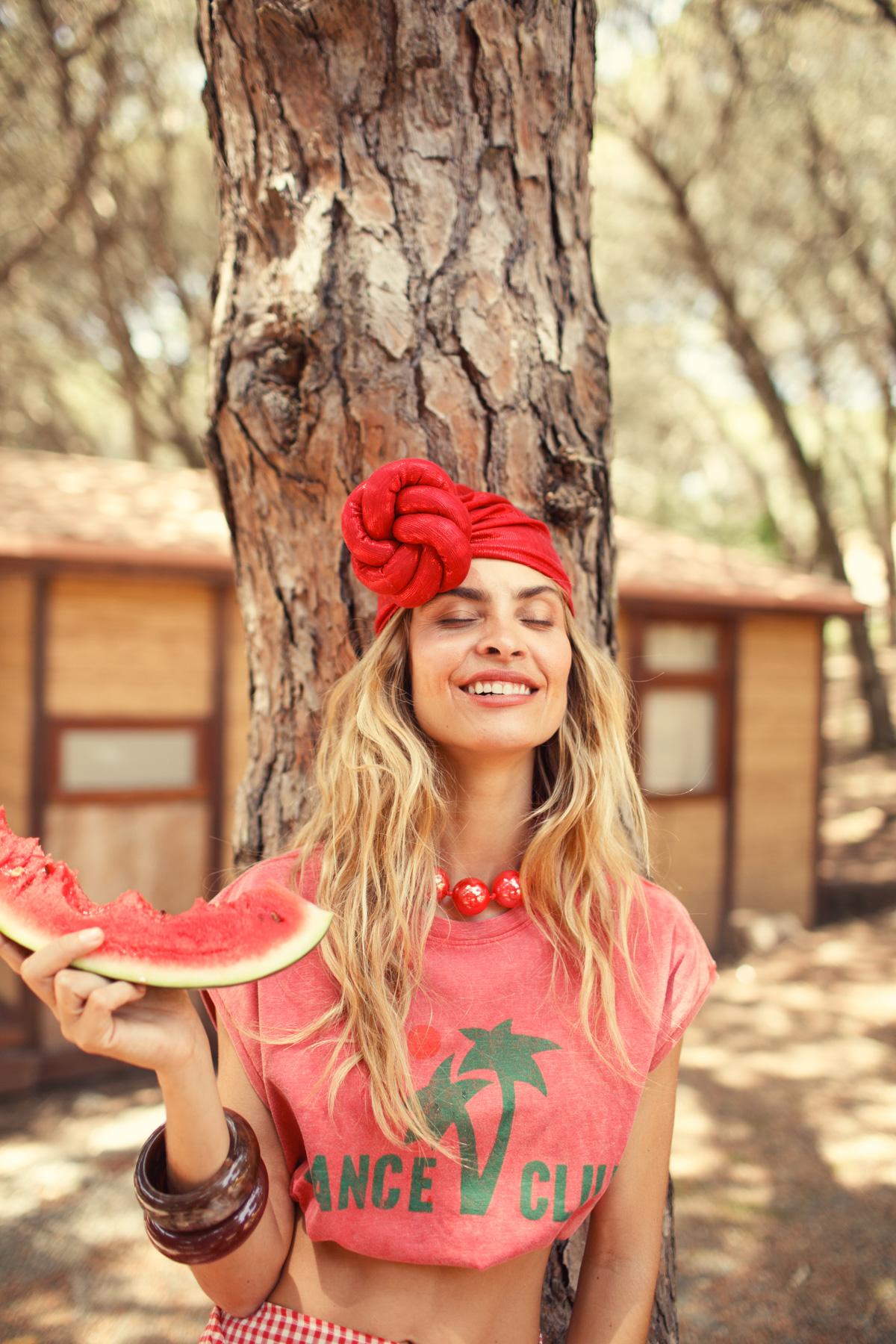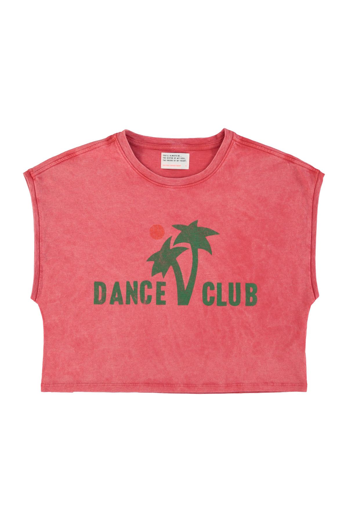 Sleeveless t-shirt/top w/ round neck | Coral w/ "dance club" print
