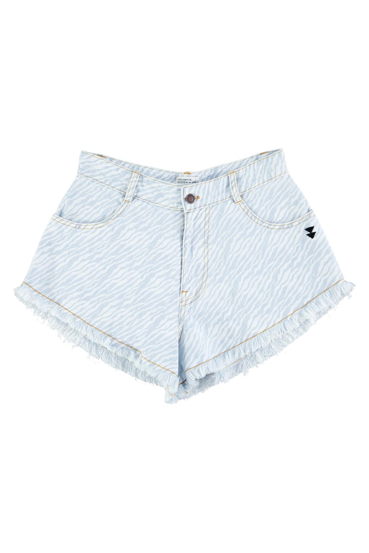 | Shorts w/ fringes | Light blue denim w/ zebra print |